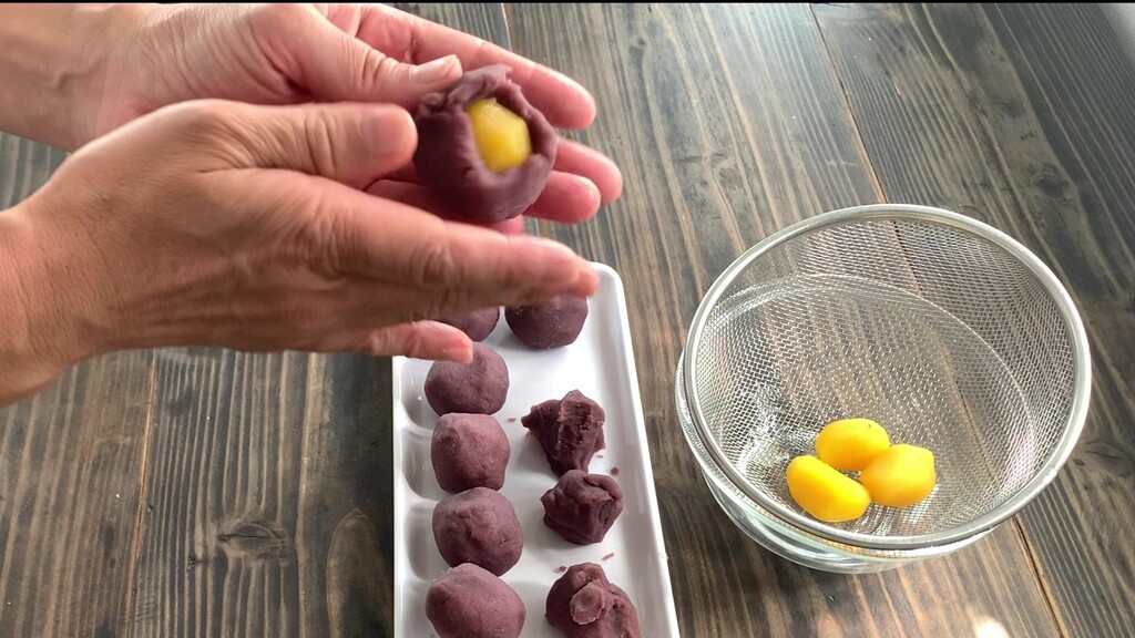 栗は蜜をきり、漉し餡を10等分にし、栗の甘露煮を包んでおく。
