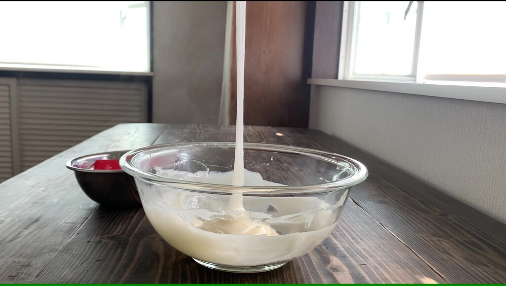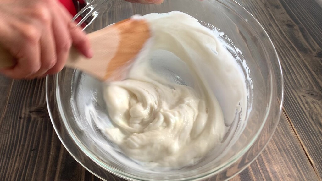 最後にもう一度レンジに2分かけ(レンジの中で沸騰する)、取り出しよく混ぜる。なめらかでリボン状に落ちる生地になる。