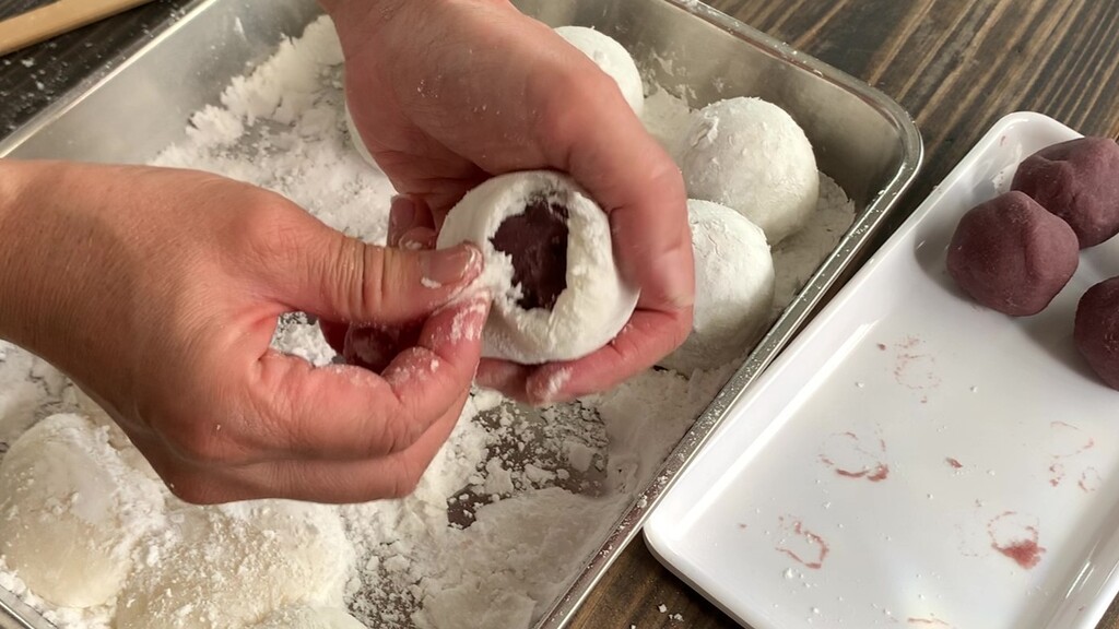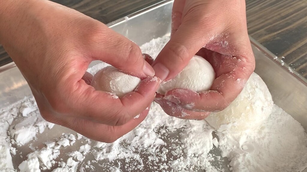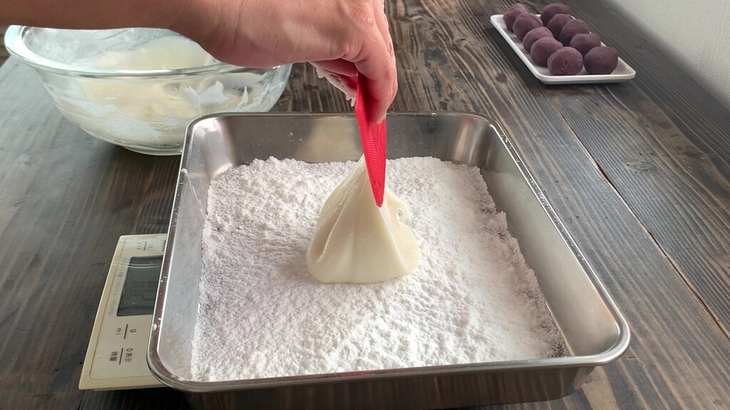栗の入った中餡を包んで、刷毛で粉をはらう。