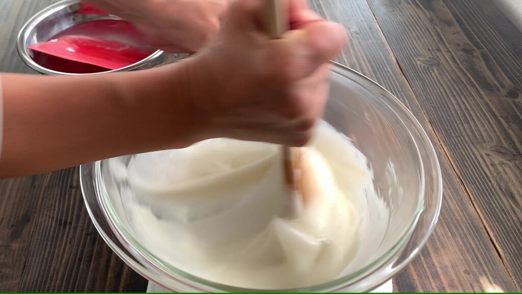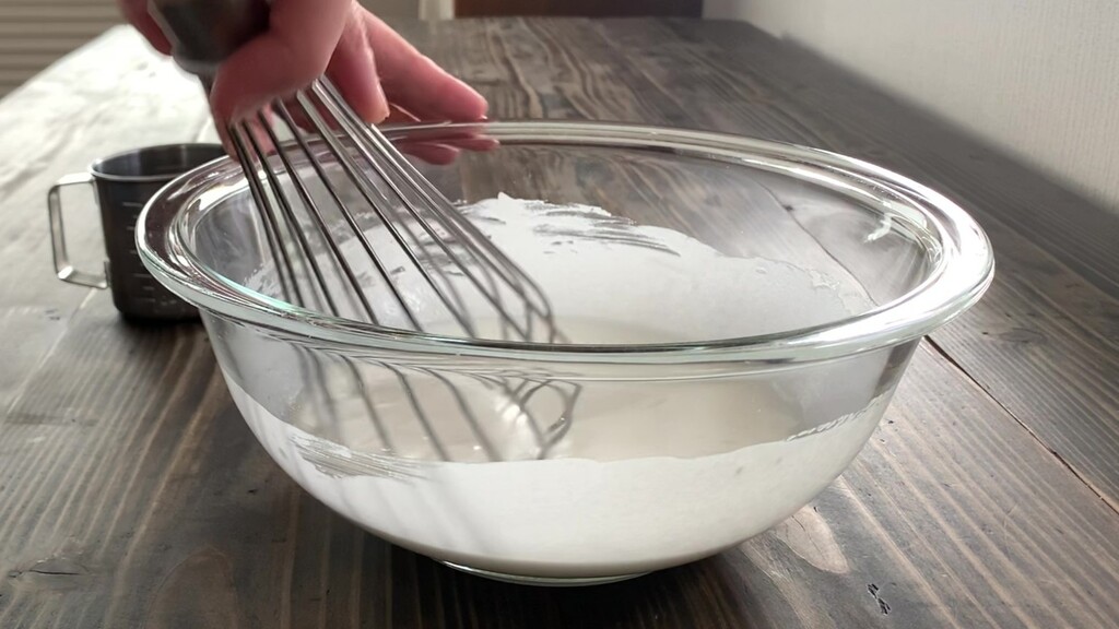 耐熱ボールに餅粉と上白糖をホイッパーで攪拌し、水を加えなめらかに混ぜる。