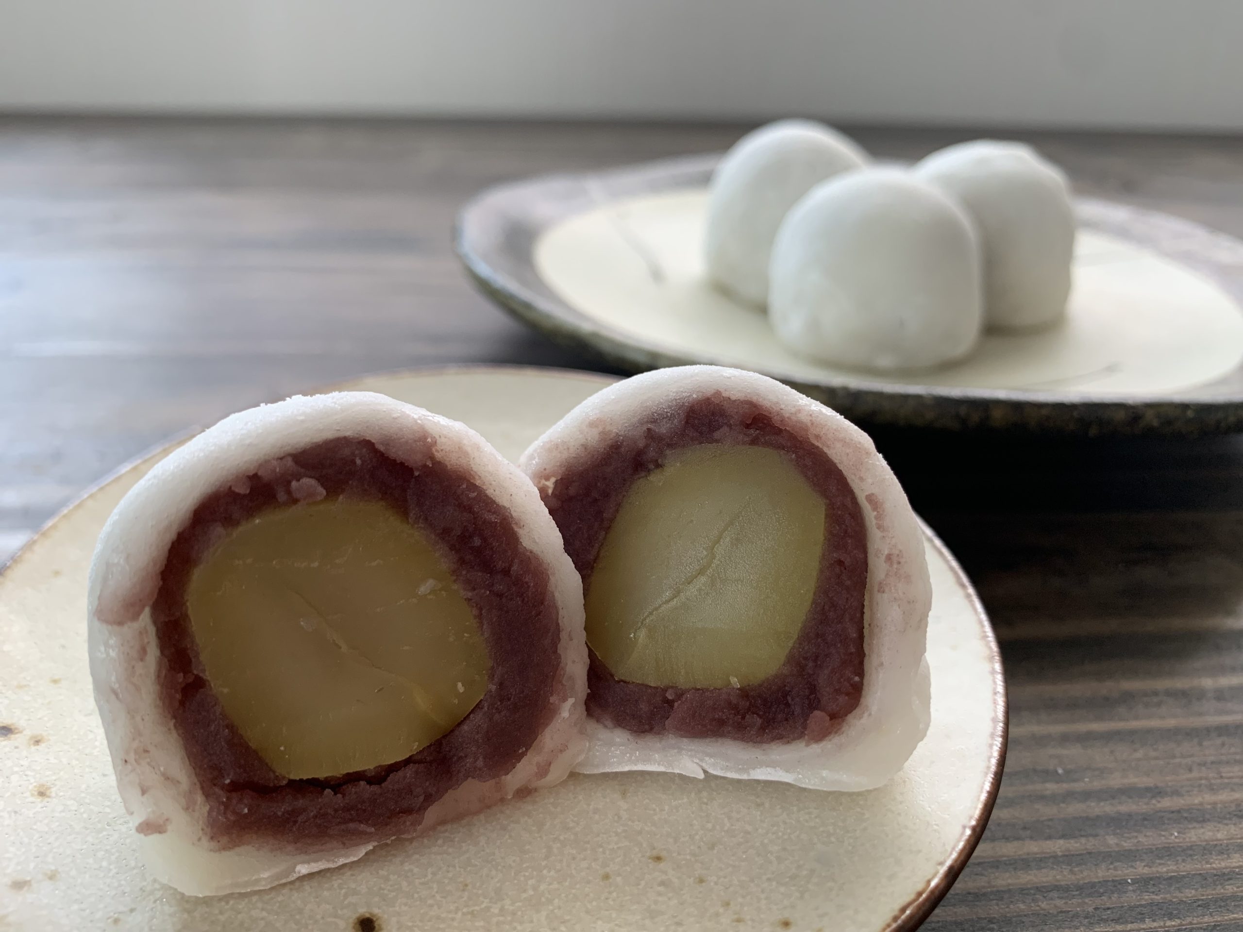 栗大福には柔らかい栗の甘露煮が合うと思います。