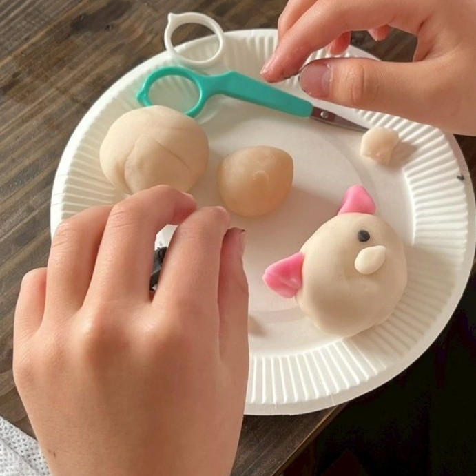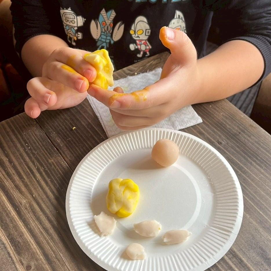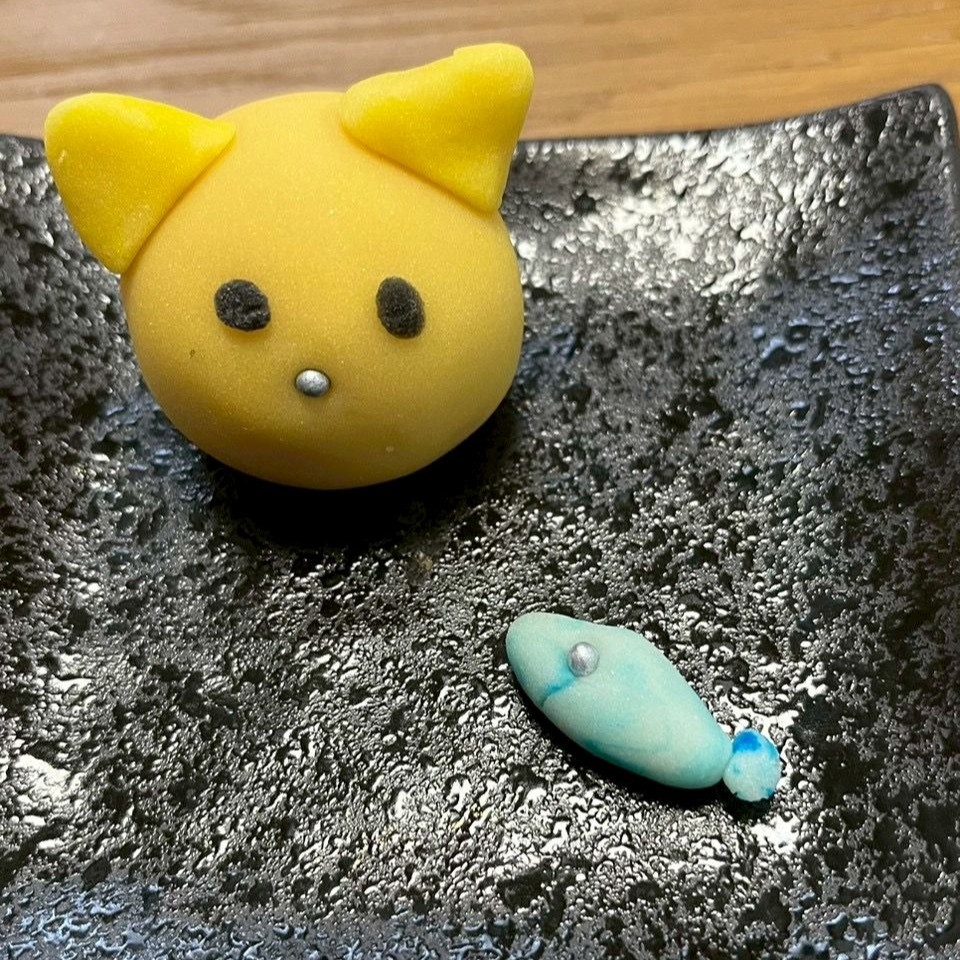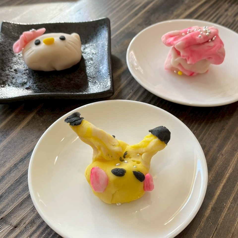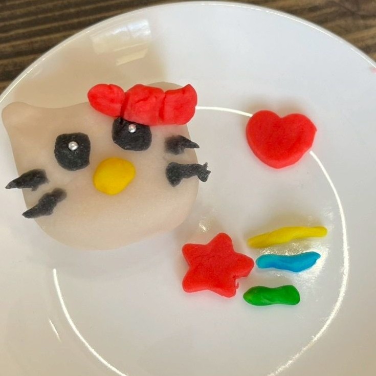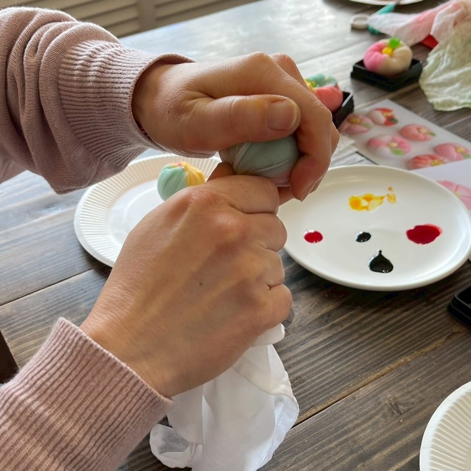 練り切りを好きな色に染めて、動物や花、キャラクターなど何でも作ってくださいね、とご説明すると、皆さん「何作ろうかなぁ」と悩みながら思い思いに作っていらっしゃいました。