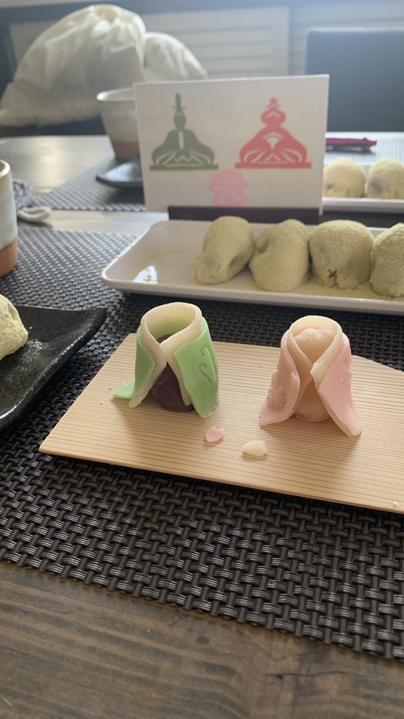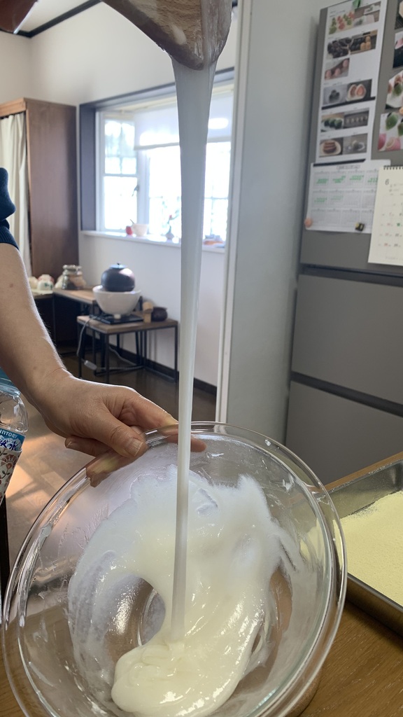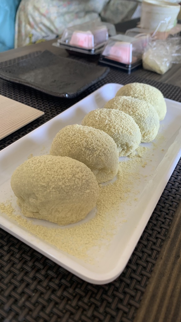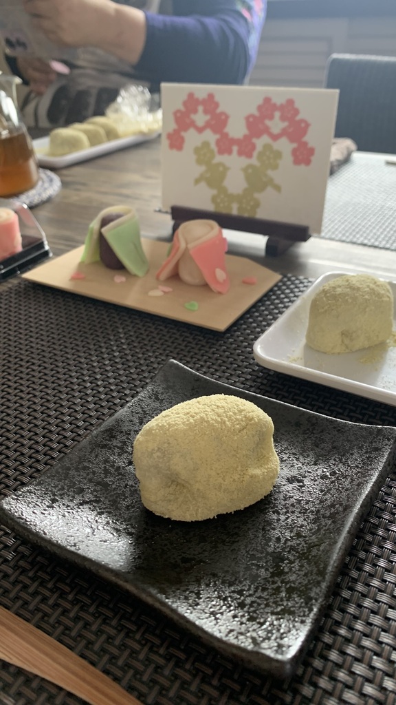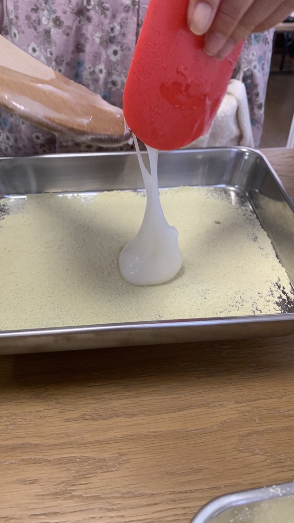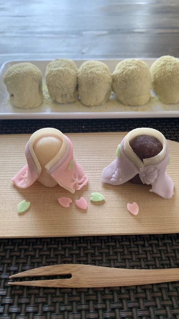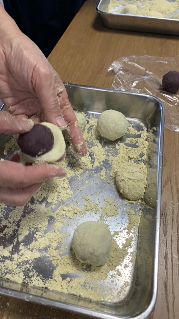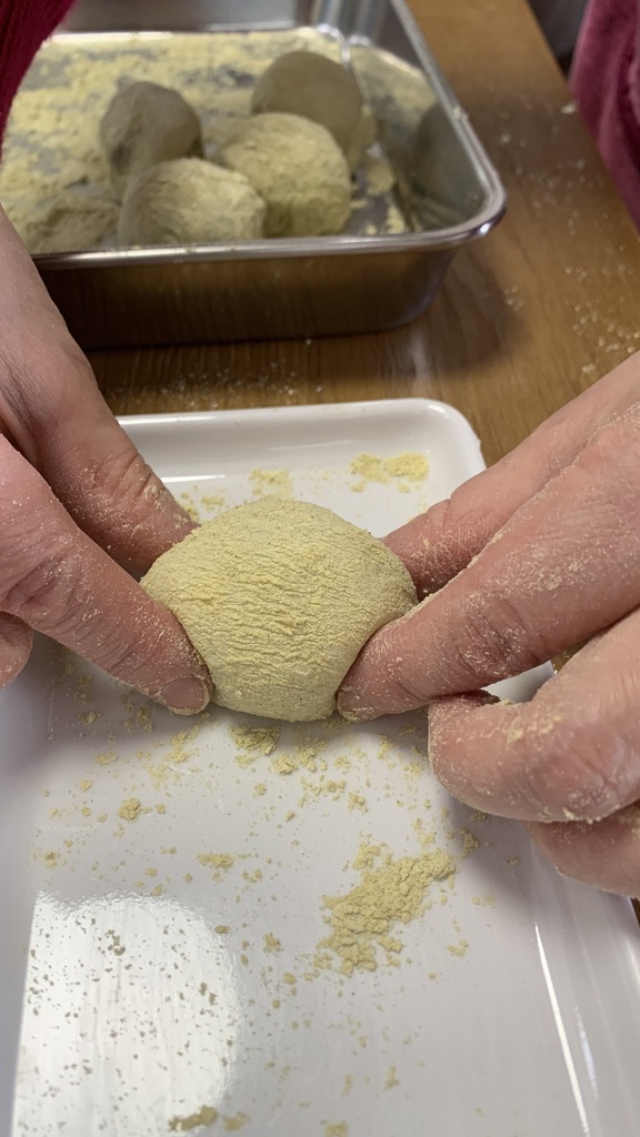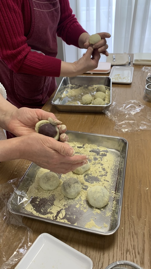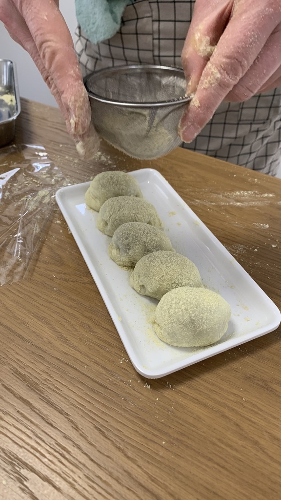 うぐいす餅はなめらかで柔らかい生地を作って包みました。皆さん生地をすくって「わぁトロトロ~」「こんなんで包めるんですか?」とおっしゃってましたがポイントをつかめば大丈夫です。上手にうぐいす餅を作ってくださってました。最後にウグイスきな粉を振りかけて粗を隠すという技もお伝えしましたね(笑)