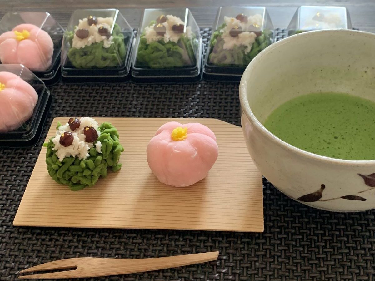最後にお抹茶でご試食いただき、残りの和菓子はお持ち帰りです。(レッスンによって、種類や個数が変わることがあります。)